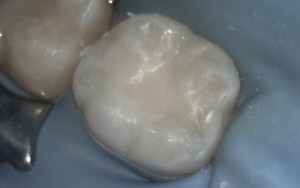 This is a high fluoride releasing filling material that allows enhanced remineralisation of surrounding tooth structure. It is more of a solid white colour, so it useful as a base under deep fillings, fissure sealants, and temporary fillings to stabilize decay when many teeth are involved. It may also prevent plaque from growing around the filling itself. A pink-coloured form of this filling has added pigments that makes it heat up and set faster under blue light.